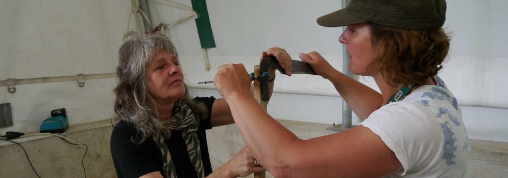 Der Natursandstein wird fest in die Hand genommen, der Daumen in der Faust verborgen. Nun wetzen sie mit ruhigen, festen Strichen immer vom Bart in Richtung Spitze. Abwechselnd die Innen- und Außenseite des Sensenblattes. Längere Striche sind eleganter, kürzere Striche sind genauso effizient. Immer aber nach vorne und gleichzeitig nach unten. In unseren Kursen lernen sie effizientes Wetzen von hervorragend ausgebildeten Sensenlehrern und Sensenlehrerinnen.