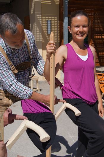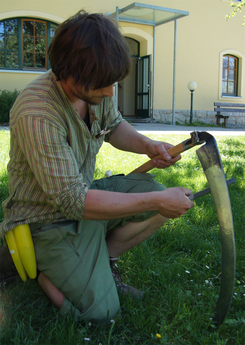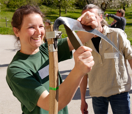 Eine effiziente, gesundheitsbewusste Mähhaltung ist nur mit einem richtig an den Körper angepassten Sensenworb und einer richtig eingestellten, scharfen Sense möglich.
