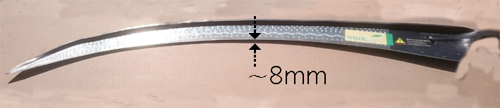 Zwischen Daumen und Zeigefinger gehalten (Vorsicht scharfe Schneide!) ist zu fühlen, wie die Sensen-blattstärke im Bereich des Dengels keilförmig immer dünner wird bis sie an der Schneide auf fast null Millimeter zusammenläuft.