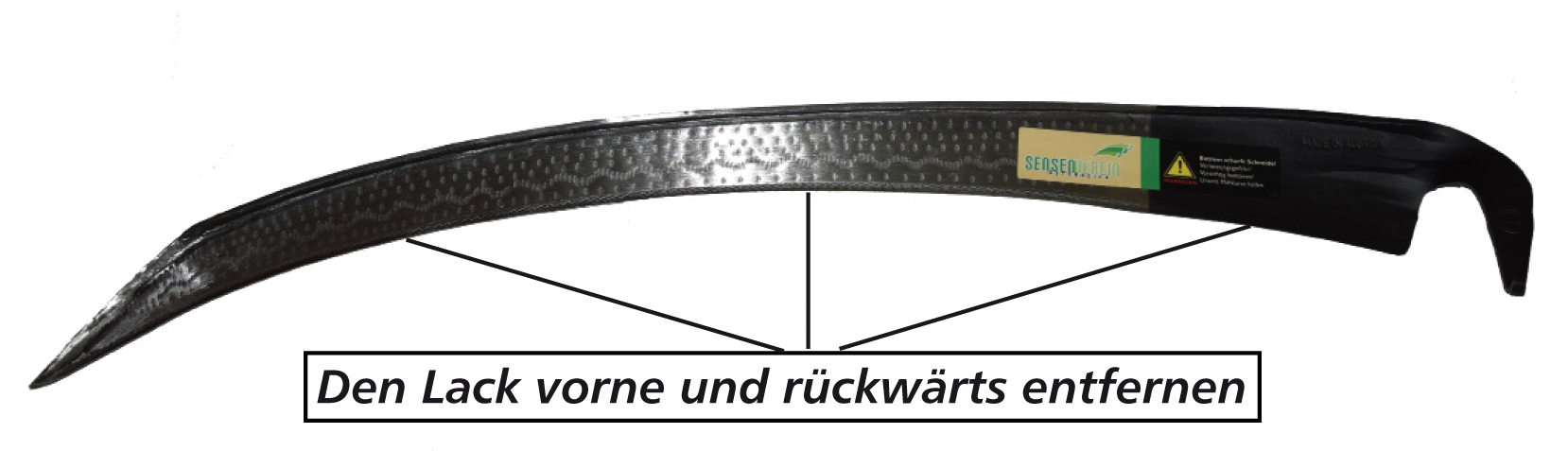 Der Dengel, das ist der ca. 4mm breite Bereich an der Schneide, muss beidseitig vom Schutzlack befreit werden. Zum Entfernen des Lackes die Sense flach auflegen und Schleifpapier (Korn 80) mit einem Schleifblock verwenden. Alternativ kann auch ein Schaber verwendet werden.