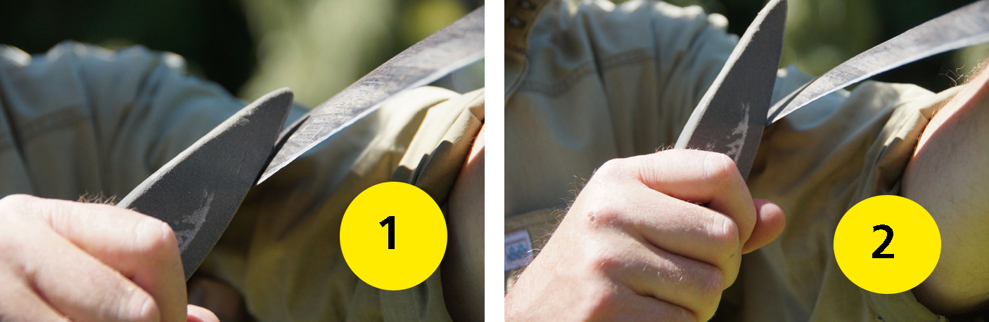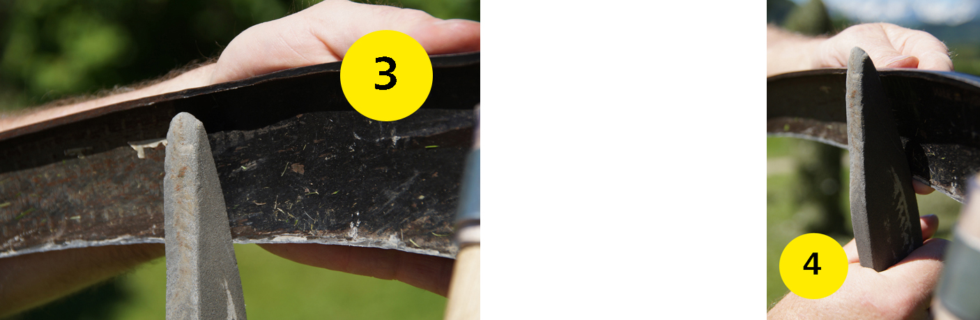 Links (3): Wirksamer Anstellwinkel auf der Innenseite des Blattes. Rechts (4): Hilfestellung für den richtigen Winkel: Die Spitze des Steines an den Sensenrücken anlegen. Das wäre der optimale Winkel.