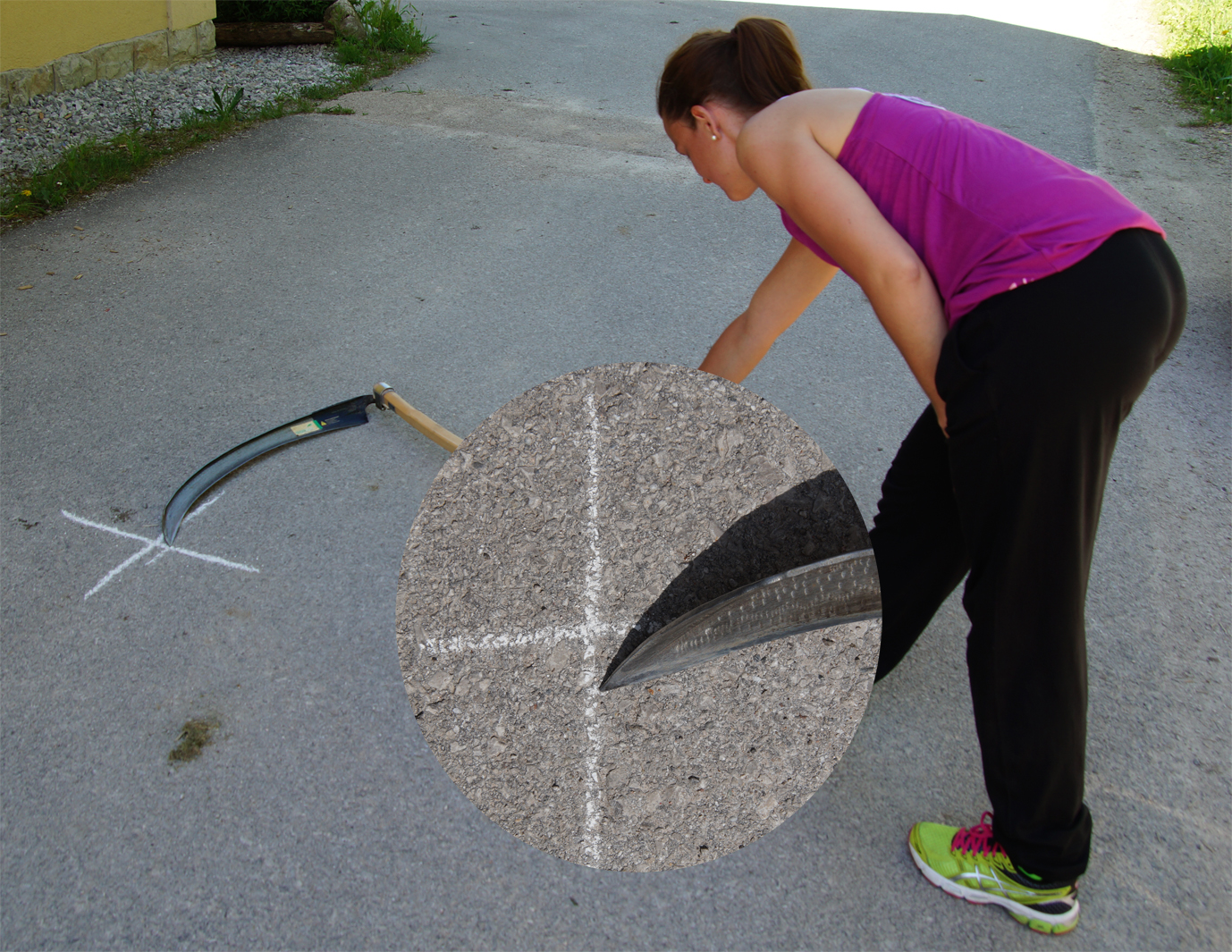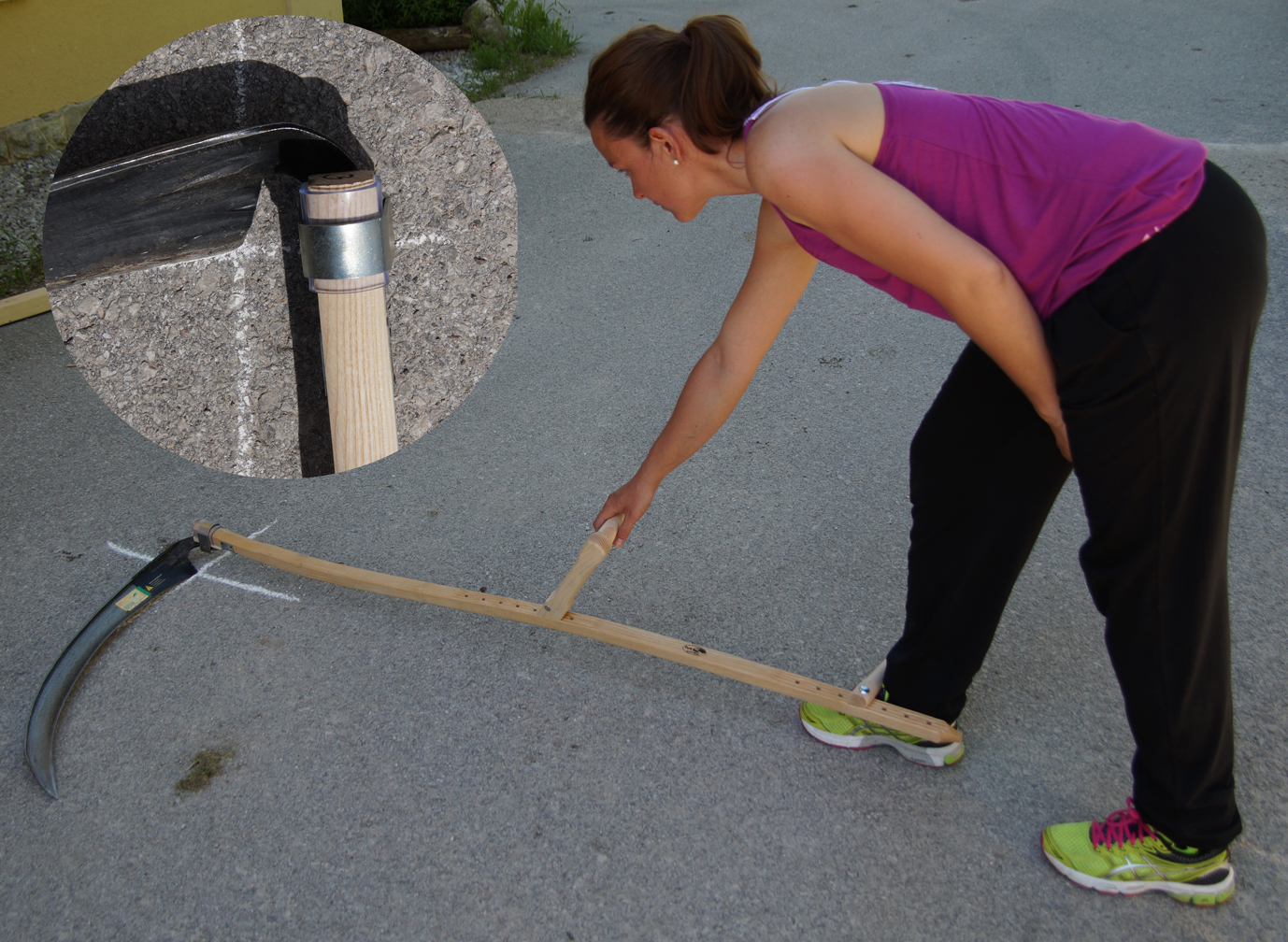 Nun sollten die Beine leicht (Schulterbreite) gegrätscht und die Knie ein wenig gebeugt werden, bis das Sensenblatt auf dem Boden liegt. Der Oberkörper wird keinesfalls gebeugt.