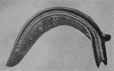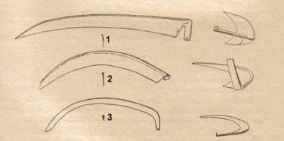Die eine Form bestand aus einem geraden Holzstab mit einer rechtwinkelig eingesetzten und weit hervorragenden Feuersteinklinge, welche in Schweizer Pfahlbauten gefunden wurde. Die zweite Form bestand aus einem gekrümmten Holzstück, an dessen konkaver Seite eine Rinne eingeschnitten und darin ein Feuersteinsplitter der Länge nach eingekittet war.